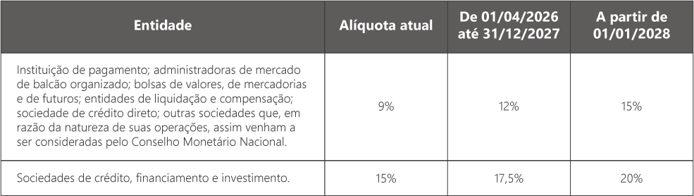 A CSLL foi mantida em 20% para bancos de qualquer espécie e em 15% para as pessoas jurídicas de seguros privados, distribuidoras de valores mobiliários, corretoras de câmbio e de valores mobiliários, sociedades de crédito imobiliário, administradoras de cartões de crédito, sociedades de arrendamento mercantil, cooperativas de crédito e associações de poupança e empréstimo.