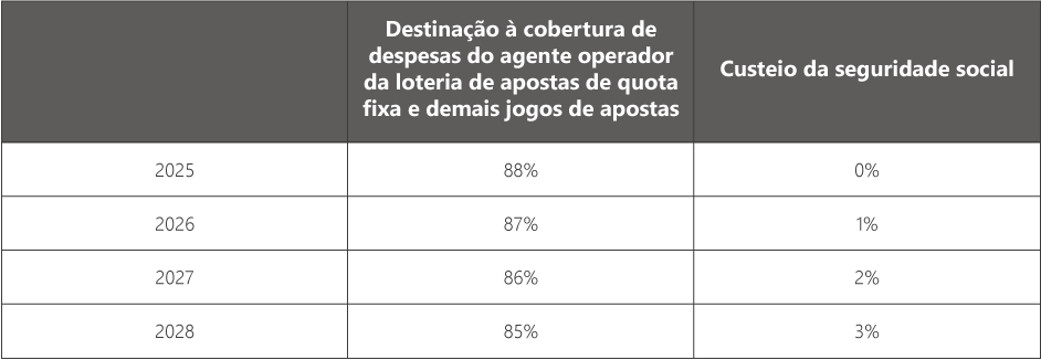 Além disso, o novo texto reduziu o percentual a ser destinado exclusivamente à cobertura de despesas do agente operador, de 88% para 85%, destinando a diferença de 3% ao custeio da seguridade social. A redução será feita de forma progressiva, conforme tabela abaixo: